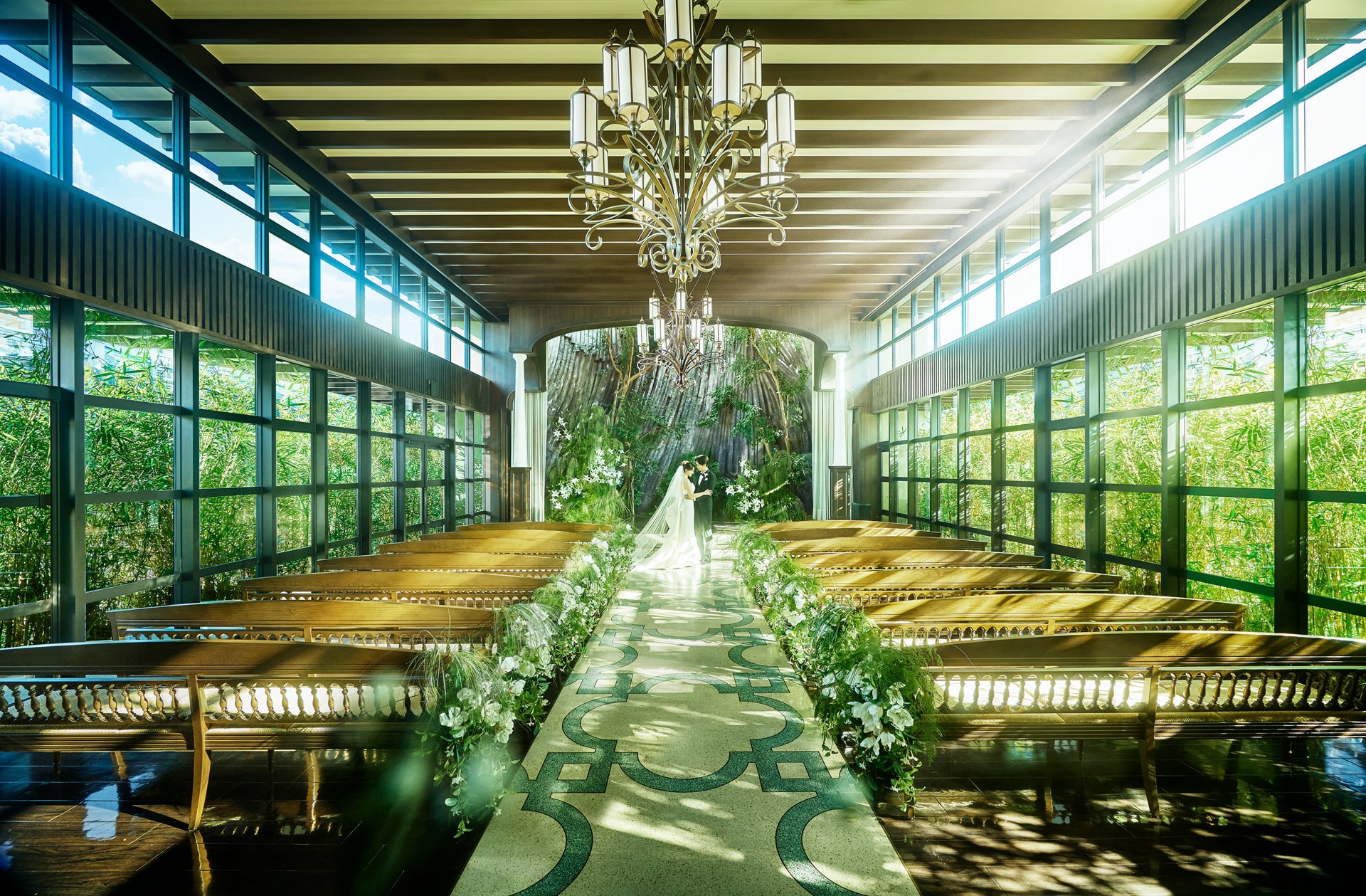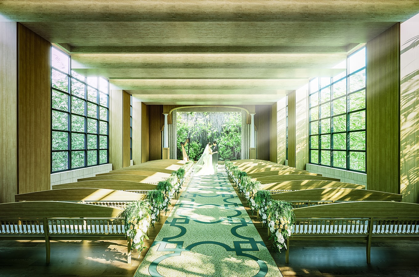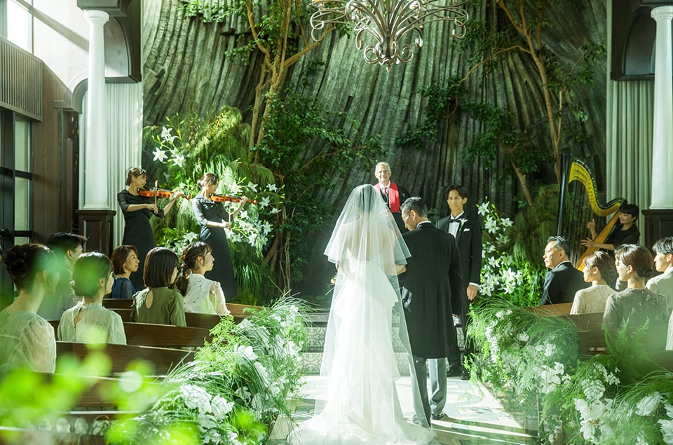 挙式を執り行うチャペルは、THE CLASSICA GOENのコンセプトを象徴する温かな光を取り入れてた空間。陽光に包まれながら、ふたりの誓いが自然と心に刻まれる、そして大切なご親族、ゲストの方々とのご縁が円となるような温かな場所です。