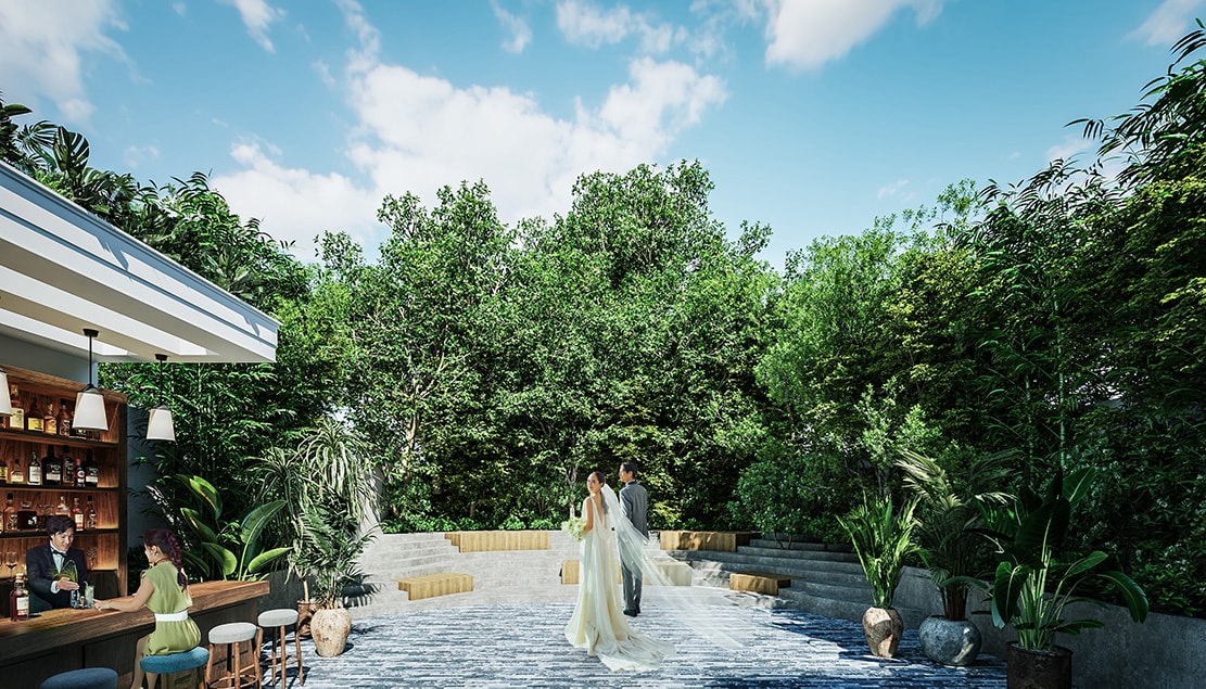 吹き抜けのオープンバルコニーで空間を五感で楽しめる開放的な心地良さに包まれたパーティルーム。オープンキッチンと螺旋階段が併設され、躍動感とリズムのある空間が広がっています。木や石などの天然素材にこだわり、趣や風合いを感じながら特別な時間を大切な人たちとお過ごしください。