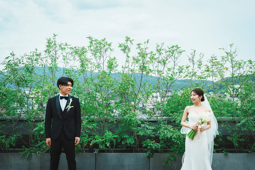 東山を望み陽光溢れるテラスでの写真撮影は、