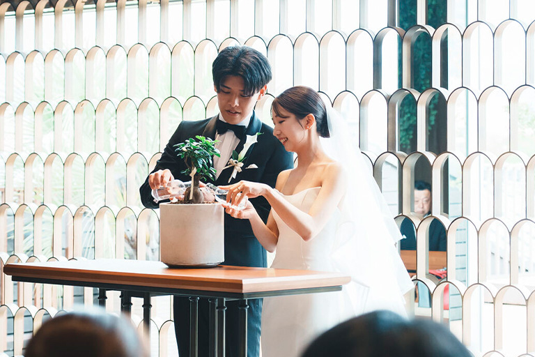 それぞれの水をひとつに注ぎ、新しい家族のはじまりを表すセレモニーは、