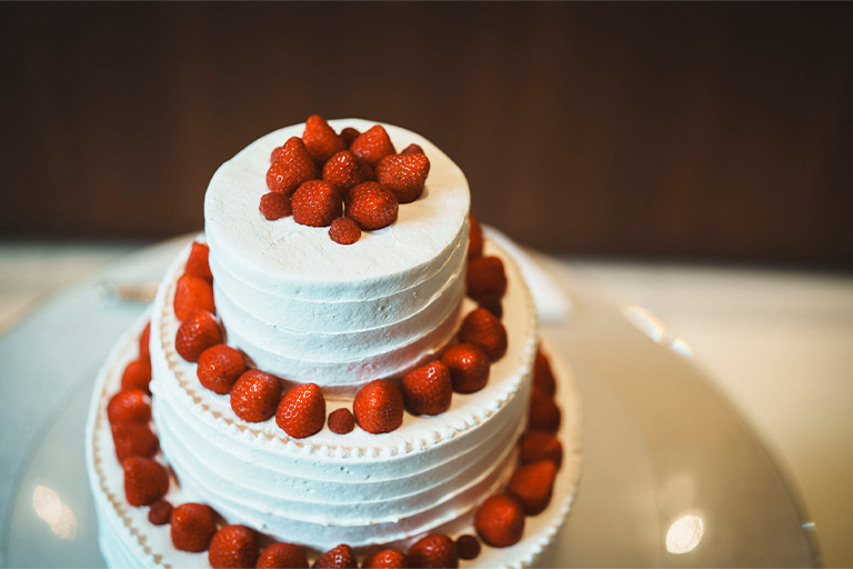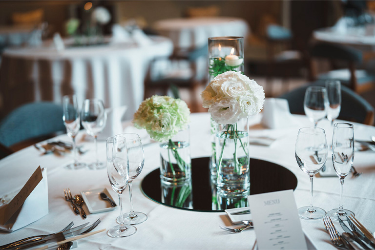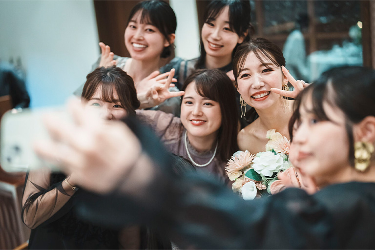 大きな窓から緑を望む会場は開放感にあふれ、自然光に包まれた空間にゲストの笑顔が映えます。