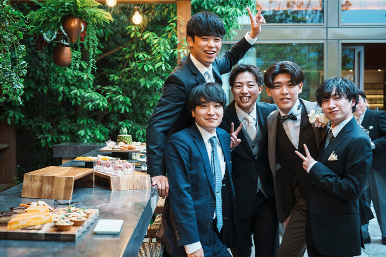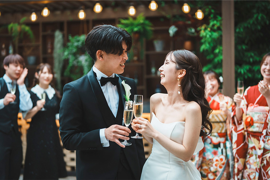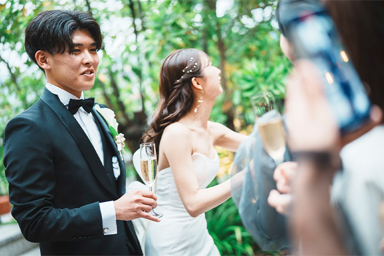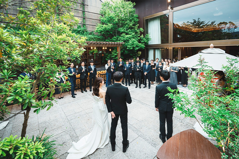 堅苦しくなく自由に過ごせるようにと、乾杯は緑溢れるガーデンにて。