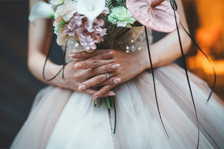 お色直し入場は、柔らかなベージュピンクのドレスを選ばれました。