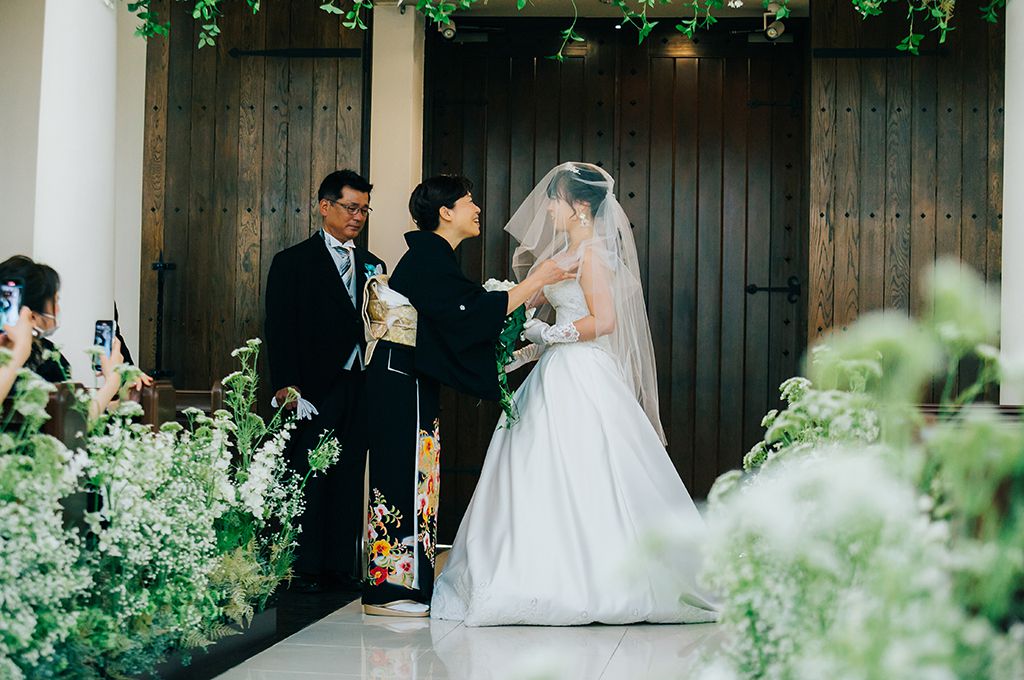 挙式では、両家の親御様にも活躍していただけるよう、ご新郎様のお母さまには「ジャケットセレモニー」を、ご新婦様のお母さまには「ベールダウンセレモニー」を行っていただきました。
