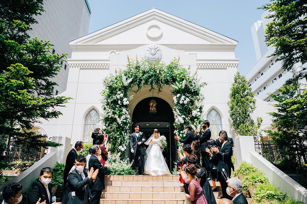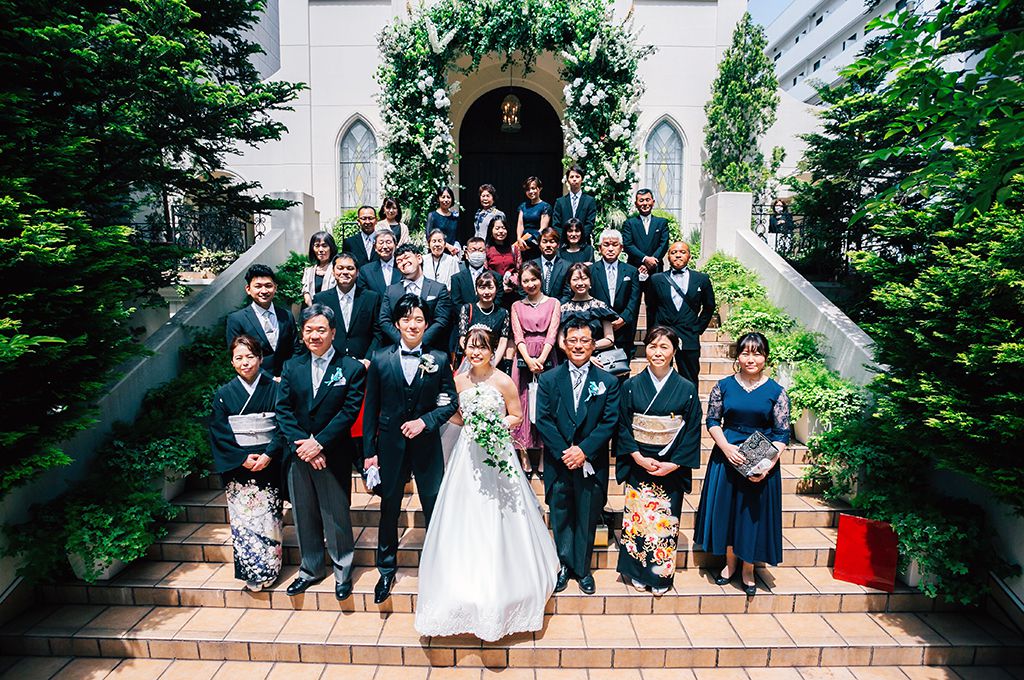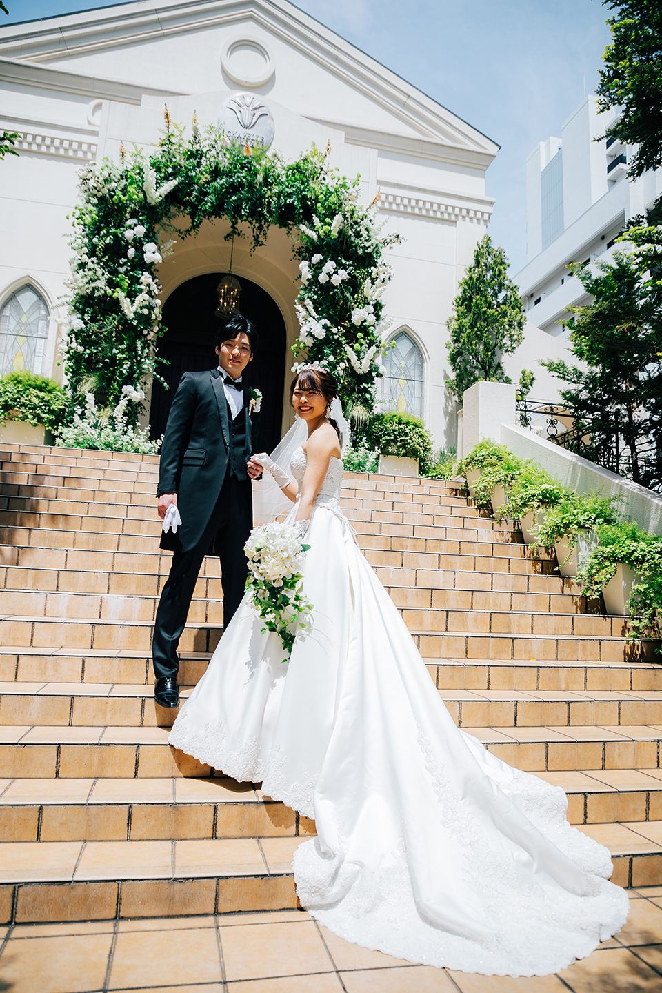 挙式の後には、開放的な青空の下、たくさんの緑とフラワーに囲まれたチャペル大階段でアフターセレモニーのひとときを過ごされました。