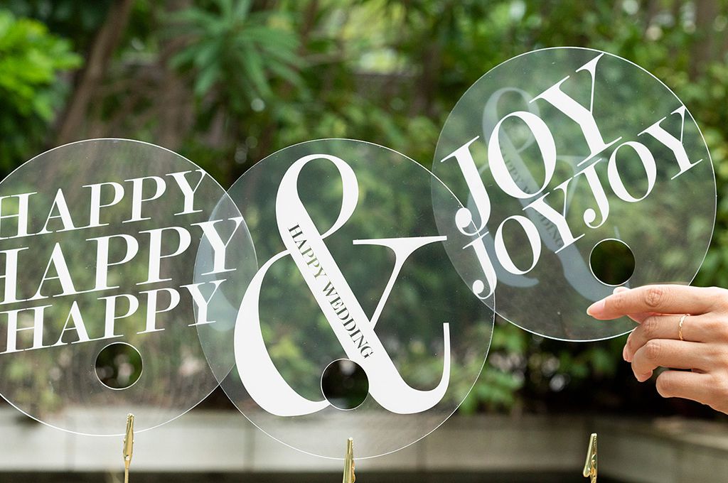 パーティでは、ゲストに安心して楽しんでいただけるよう『卓上パテーション』や、飛沫防止にも活躍するお洒落なフォトプロップス『ハピネス・ハンディシールド』をご用意されたおふたり。