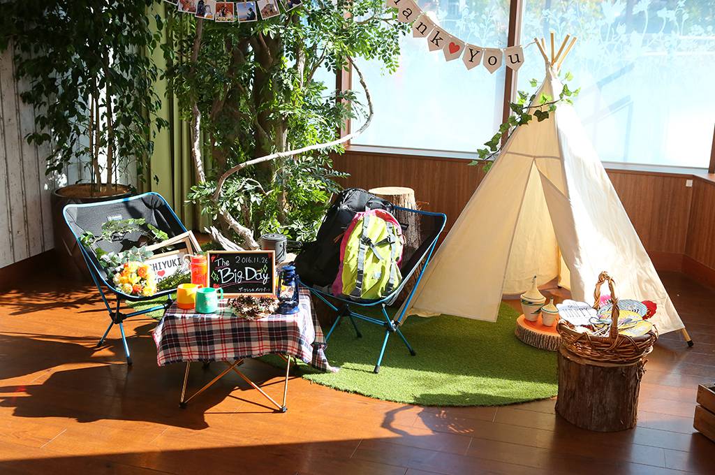ゲストが一目で「ふたりらしいっ!」と声をあげる登山グッズ。専用ホワイエには、テントやおふたり愛用の登山ウェア、 リュックやブランケットなどで世界観を創りあげました。