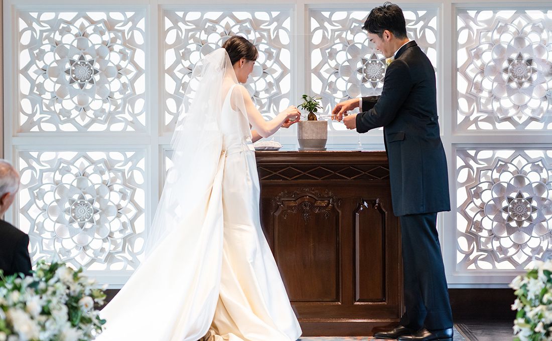 挙式前にゲストから「ガジュマル」に土を入れ、挙式中におふたりで水を注ぎます。