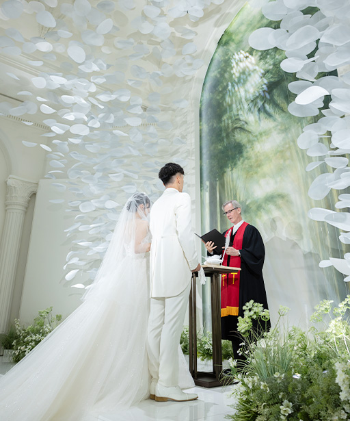 花びらの光が天井いっぱいに広がる新チャペルで、いよいよ挙式がスタート。