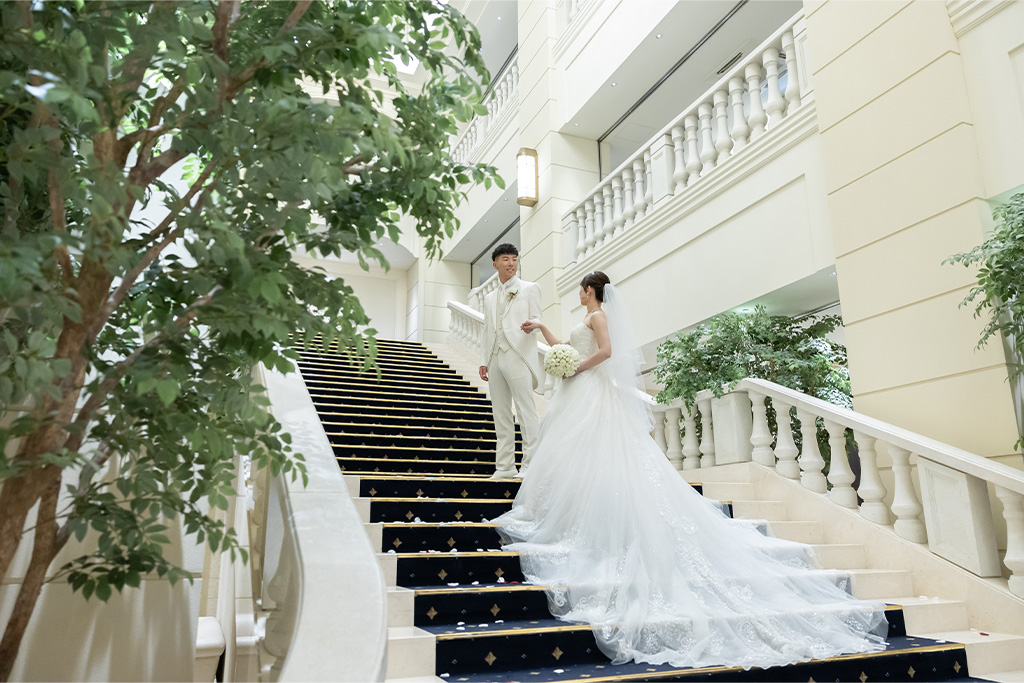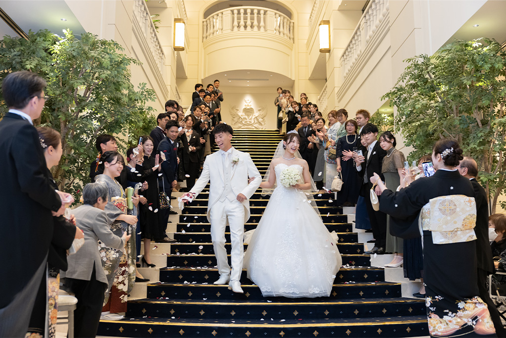 圧巻の大階段に、祝福の色鮮やかな花びらがおふたりの門出を華やかに彩ります。