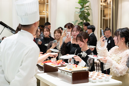 大きな窓の向こうに緑が広がる開放的な空間で、感謝の想いを込めたデザートブッフェのおもてなしも。