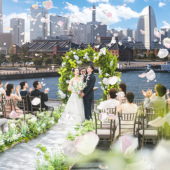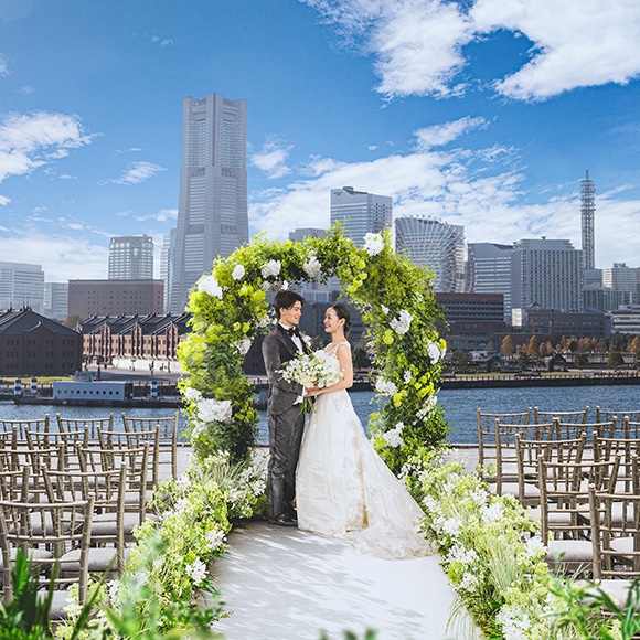 やわらかな光と緑の中、最上階のセレモニースペースで誓う、ふたりの愛の物語。
