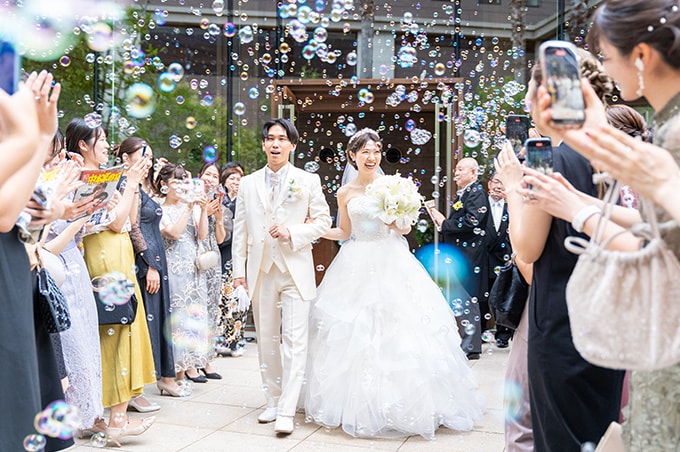 空の下へと広がるバブルシャワーに包まれ、幸せそうな笑顔のおふたりがとても印象的でした。