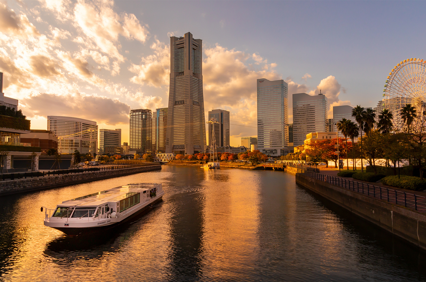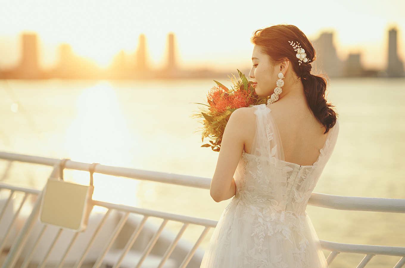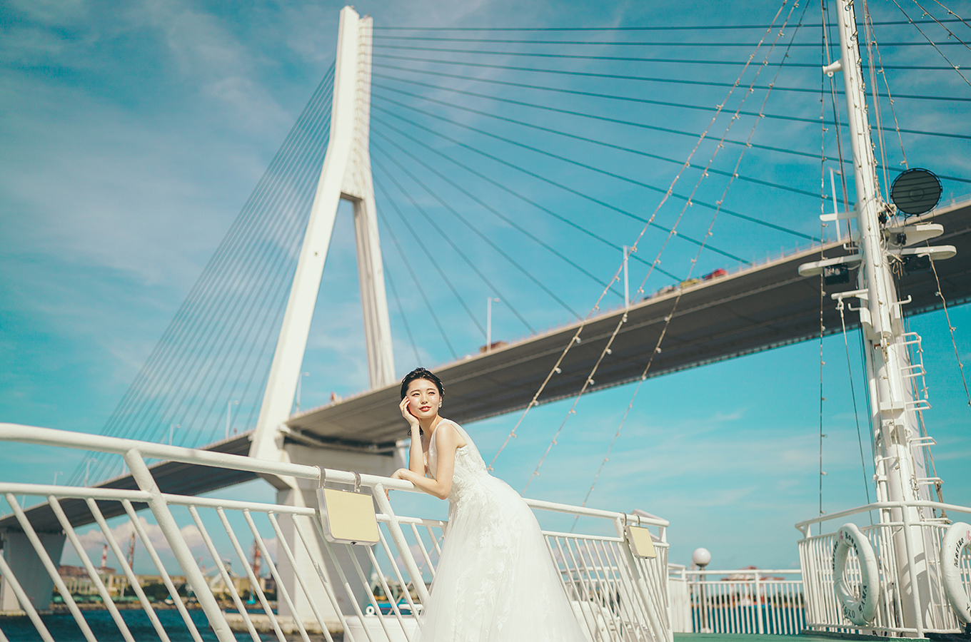 観覧車やベイブリッジを背景に船上でフォトウエディング