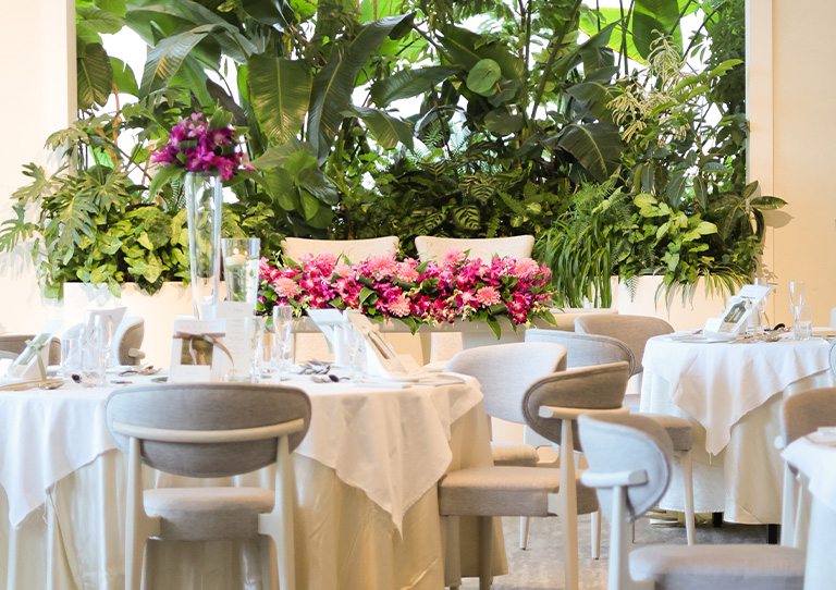 そのどちらも叶う空間に、淡いピンクとホワイトの花々を添え、