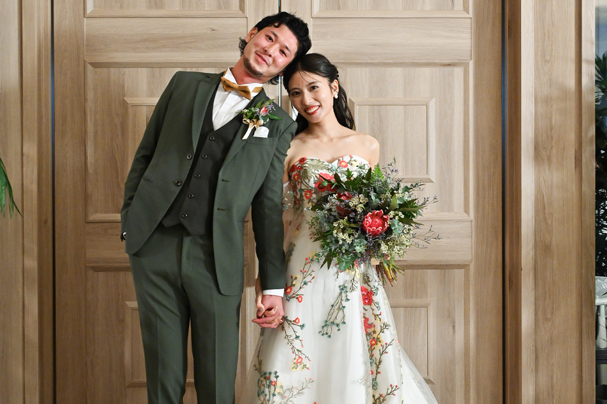 オフショルダーに繊細な花柄をあしらったドレスでお色直し入場。