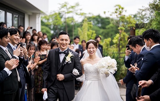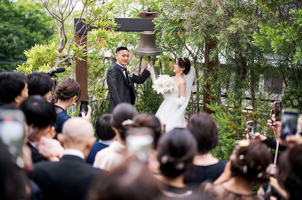 幸せの鐘の音が鳴り響く中、ふたりの新たな人生のはじまりを祝う祝福ムードに包まれていました。