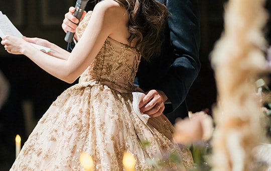 再入場では華やかで高級感のあるゴールドのドレスに身を包み、ゲストからは大きな歓声と拍手が。