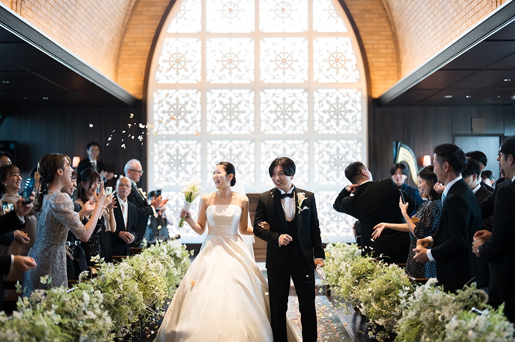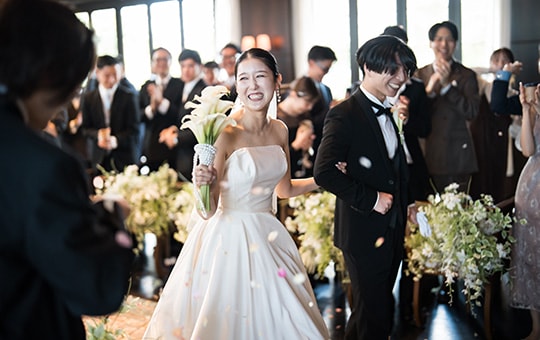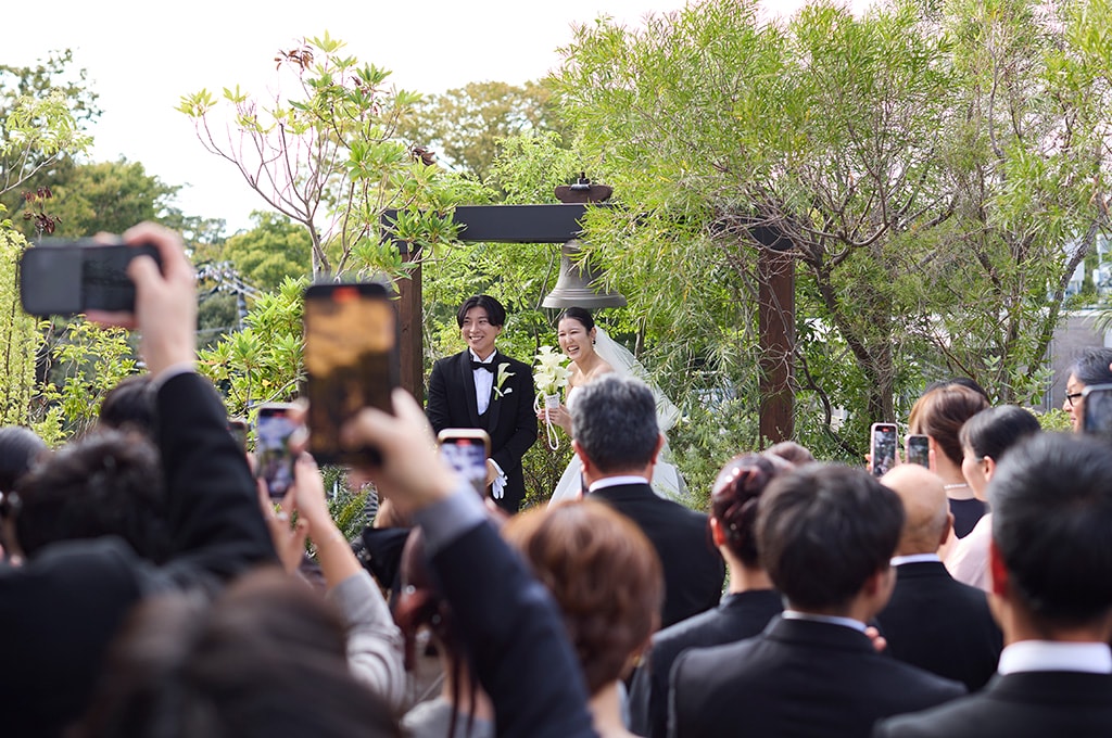 ゲストとの距離が近く、祝福の声に包まれ嬉しそうな表情の新郎新婦様。