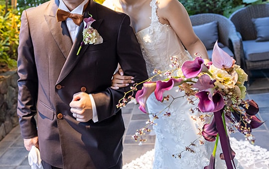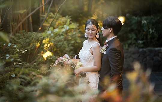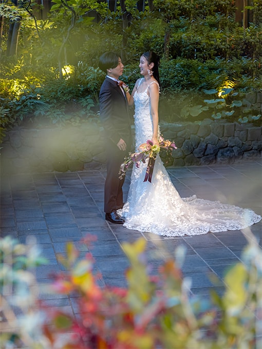 披露宴再入場を前に、ガーデンで過ごす静かな撮影のひととき。