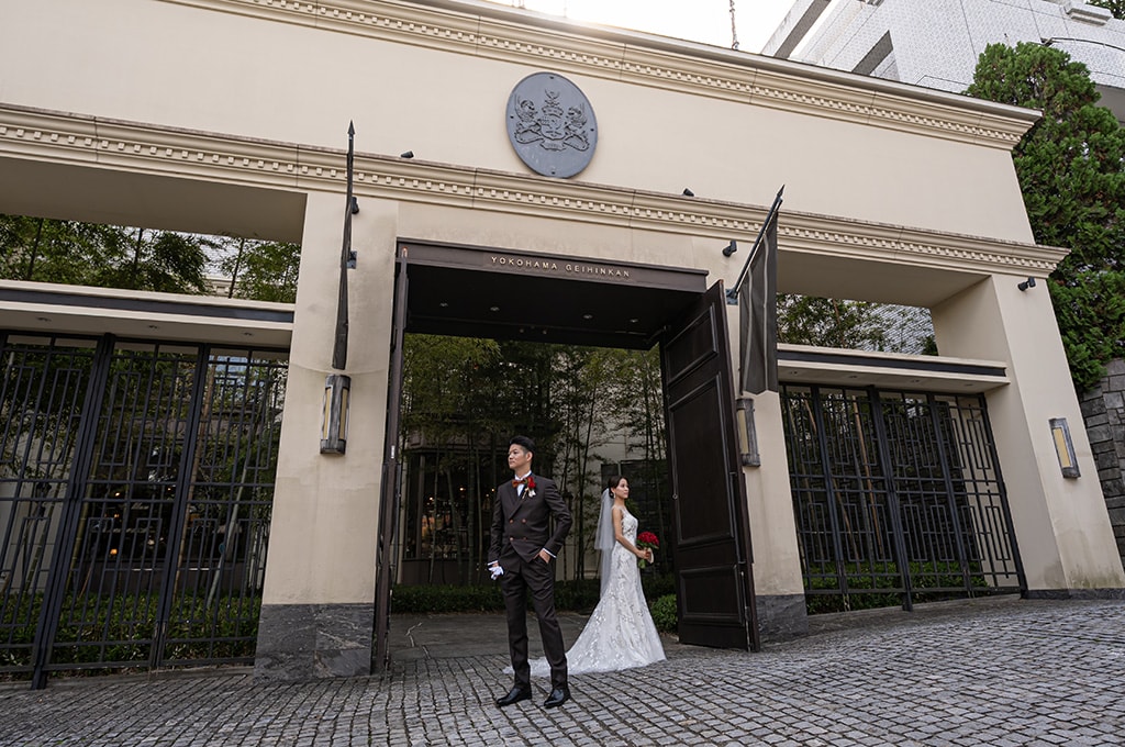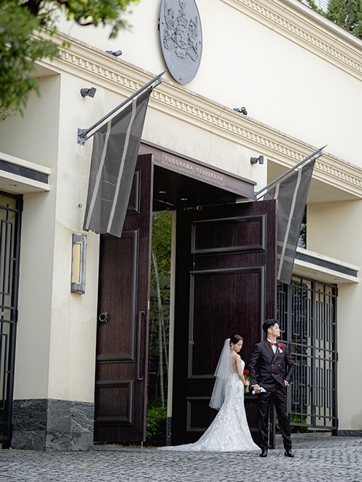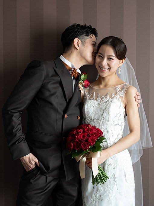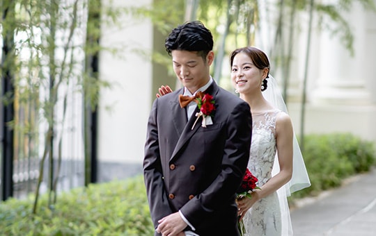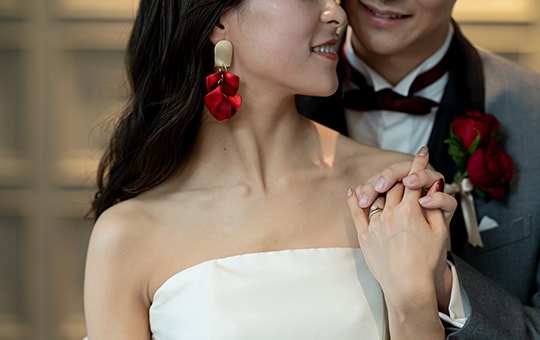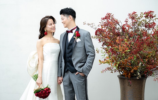 耳元やブーケに添えたレッド×ゴールドの組み合わせが凛としたアクセントとなり、