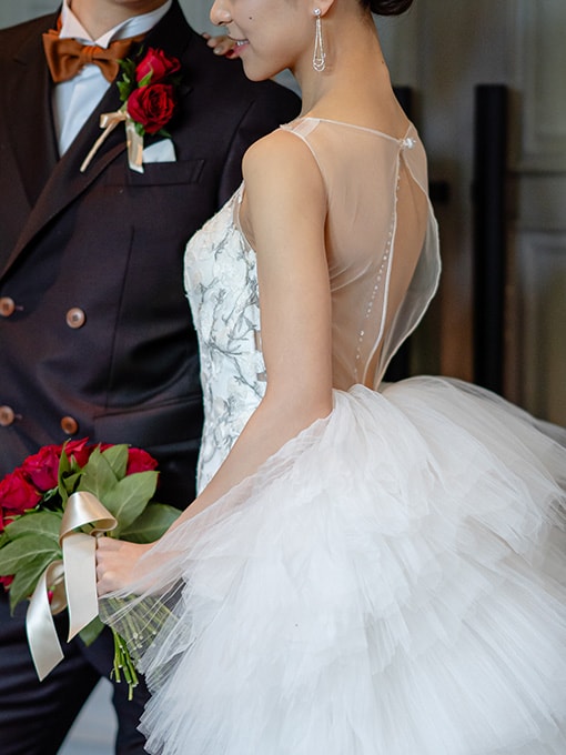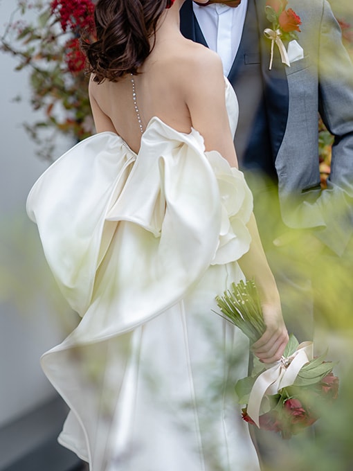 大きなリボンフリルが歩みに合わせて揺れ、花嫁の佇まいをより美しく印象的に映し出します。